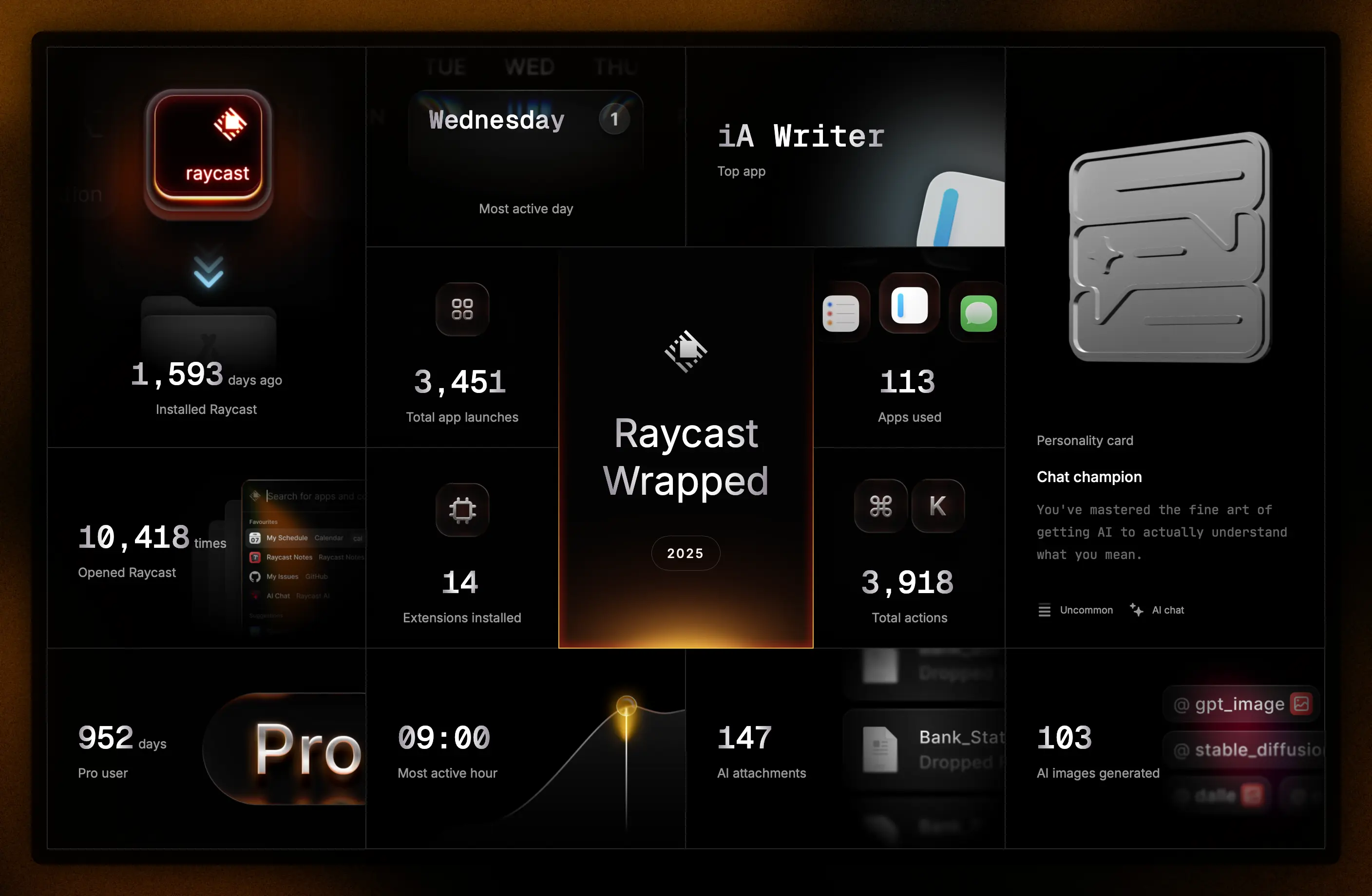 Raycast is an app launcher that has turned into a massive collection of useful tools and an AI assistant. I use it on Mac, iOS and Windows. New AI models are usually added shortly after release. I’ve set up several system prompts and tool configurations for different tasks. Raycast also supports connecting to MCP Servers, which I’ve used to run a custom NetNewsWire connector. The second image shows my Raycast Wrapped for 2025.